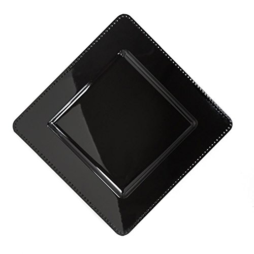 Binding : Kitchen Product Description Accentuate banquet tables with fashionable 13 in. Black Square Charger Plates 4/pack for weddings, parties, events, and home. Plate chargers offer a decorative flair to event tablescapes, adding a vivid shine to table designs. A 13 in. Black Square Charger Plate acts as a striking alternative to place mats, as a base for dinner plates, and features a raised beaded border. Intended for decorative purposes only, do not place food directly on charger. Pair square black wedding charger plates with Black Acrylic Napkin Rings. 0