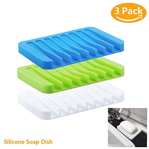 Bathroom Soap Dishes, Flexible Silicone Soap Holder for Shower /Bathroom/Kitchen/Sink/Counter Top, Keep Bar Soap /Sponges /Scrubbers Dry & Clean, Pack of 3