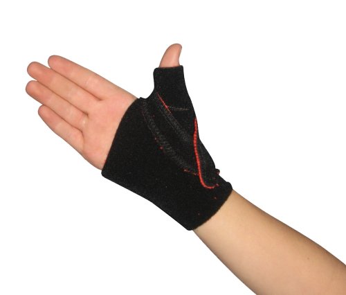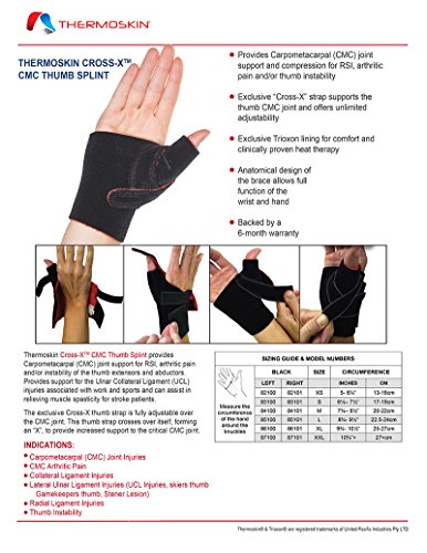 ReleaseDate : 2015-05-28 Studio : Thermoskin Publisher : Thermoskin Binding : Health and Beauty Product Description Thermo skin Cross-X CMC Thumb Splint provides Carpometacarpal (CMC) joint support for RSI, arthritic pain and/or instability of the thumb extensors and abductors. Provides support for the Ulnar Collateral Ligament (UCL) injuries associated with work and sports and can assist in relieving muscle spasticity for stroke patients. The exclusive Cross-X thumb strap is fully adjustable over the CMC joint. This thumb strap crosses over itself, forming an "X", to provide increased support to the critical CMC joint. In a recent study Thermo skin Thermal Supports provided "Considerable Relief" or "Total Relief" of pain in 83% of patients. Sizing Guide: Measure the circumference the hand around the knuckle. X-Small 5 - 6 1/4 inches. Small 6 1/2 - 7 1/2. Medium 7 3/4 - 8 1/2. Large 8 3/4 - 9 1/2. X-Large 9 3/4 - 10 1/2. XX-Large 10 3/4 - 12 inches. 0