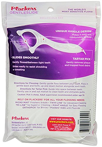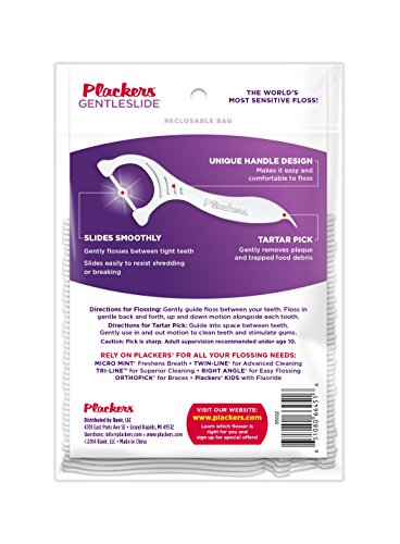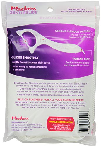 Studio : Ranir Publisher : Ranir Binding : Health and Beauty Product Description Plackers Brand Gentleslide dental flossers are manufactured with PTFE (Polytetrafluoroethylene) fiber floss. ?High-Performance PTFE Super Resistant fiber floss gently slides between teeth to remove unwanted and unsightly food debris providing a seamless user experience time after time. ?In this day and age, who has time for traditional flossing? ?And not the mention the amount of floss that is wasted compared to the amount that is actually used. ?Plackers innovative Gentleslide flosser picks make flossing an absolute breeze, not to mention the added hygiene benefits for those with sensitive teeth. Our super resistant floss gently slides between your teeth for a deeper cleaning. ?The end of handle provides a tartar toothpick which is also convenient for removing plaque and food debris. ?Without a doubt, the minty flavored floss always leaves your mouth feeling refreshed and super clean. ?Gentleslide dental flossers are great when you’re on the go and don’t have your toothbrush, toothpaste, and a sink readily available. ?Throw a pack in the car, leave one in the top drawer of your desk at the office, keep one in your purse or hand bag, backpack or travel bag and of course in a cup on the vanity of your bathroom. ?Plackers Dental Flossers will always be the best and most reliable source for flosser picks, get yours today. 0