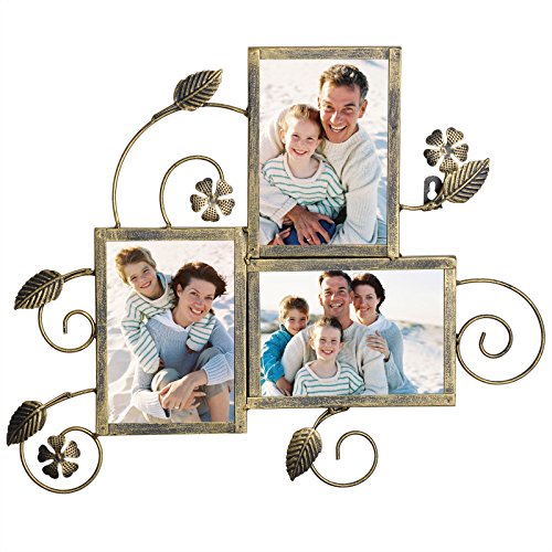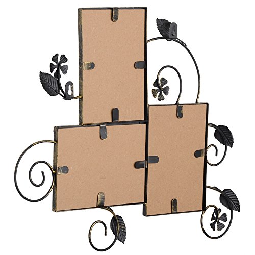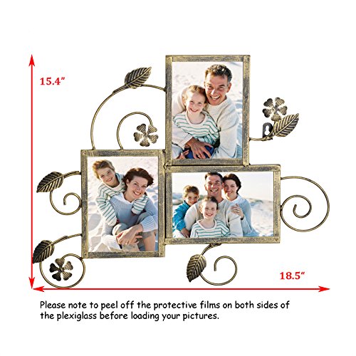 -. Feature : MATERIAL---frame constructed of high quality iron,very sturdy and durable; front cover is plexiglass, protecting your photos from dust and moist / DESIGN---flower & leaves & scapes pattern with bronze finish, looks very unique and antique / LAYOUT---Attractive "Puzzle" layout with entire size 18.5x15.4",holding three 5x7" images / FUNCTION---Preserve and showcase your lovely photos and serve as an a trractive wall décor itself / USAGE---Load your favorable photos easily with bendable pins and removable back panel