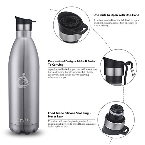 Grsta Sports Water Bottles, Double Wall Vacuum Insulated Stainless Steel Flask - 750ml - BPA Free & Leak Proof - Thermoses for Running / Cycling / Outdoor / Camping / Canteens (Silver)