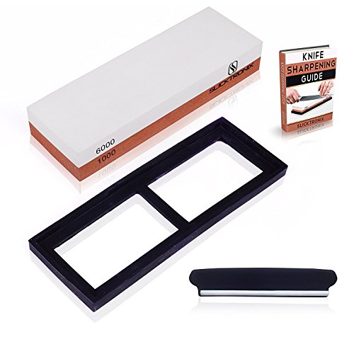 ✔SUPERIOR BUNDLE : Your complete knife sharpening kit comes with double sided (#1000/ #6000) premium quality whetstone, Rubber base for holding the stone, knife sharpening angle guide, a detailed instruction manual Ebook. Time to say goodbye to dull knives!