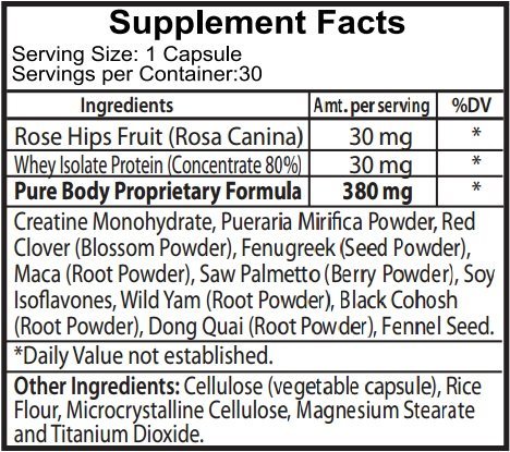 Have you ever wish you had a bigger butt? Or wished you had fuller breasts? Yes, Then Pure Body Vitamins is for you and can help you achieve your goals. PureBody Pills works by increasing your metabolism, stimulating estrogen and targeting muscle tissue growth. When those muscle tissues are targeted, the product responds by increasing the size of muscle cells, thus enlarging your buttocks and breast. The proprietary formula contains a unique blend of 81% NLT Pure Whey Protein to support a slimmer waist and creatine to support growth in the buttocks and breast. It also contains Vitamin D, Vitamin E and Calcium to support strong healthy bones and the growth of healthy hair and nails. Pure Body Pills are completely safe and healthy too with no side effects. Pure Body contains 100% natural ingredients and vitamins. The only product which combines the benefits of both Breast Pills and Butt Pills All-In-1 Pill. Simply take 1 or 2 pills a day with water. Expect the best results in 3 to 6 months. The longer you take PureBody Vitamins your results will get even better. All results are permanent.Feature