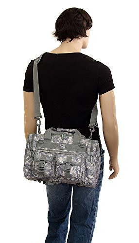 -. Binding : Misc. -. Brand : NPUSA -. Feature : PURCHASE INCLUDES: Key ring with carabiner (color varies). Slides for achieving wide or spot range. Aluminum construction. Batteries Included. Small enough to take anywhere. Or keychain with carabiner. / Material: 600D High Density Polyester for daily durable use. Interior water proof PVC lining provides protection from water. Excellent storage: 2 front buckle strap pockets, 1 zippered long front pockets, 2 side velcro pockets, 2 side zippered pockets, U-shape opening main pocket / Attachment points: molle strap system on sides, 2 front D-rings, piggy-back rear strap for attaching on to lage carts / Removable adjustable shoulder strap with pad (extends up to 43.5" length); Heavy duty branded zippers; main handle has wrap-around velcro strap for better grip / Dimensions: 15"L x 110.5"W x 9"D; Ideal use: military, tactical Assault gear, hiking, hunting, camping, sports & gym -. IsAutographed : 0 -. IsMemorabilia : 0 -. Label : NPUSA -. Manufacturer : NPUSA -. ProductGroup : Sports -. ProductTypeName : SPORTING_GOODS -. Publisher : NPUSA -. Studio : NPUSA -. Title : Mens 15" Inch Duffel Duffle Molle Tactical Shoulder Bag With Key Ring Carabiner