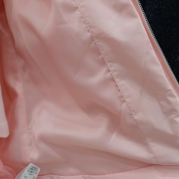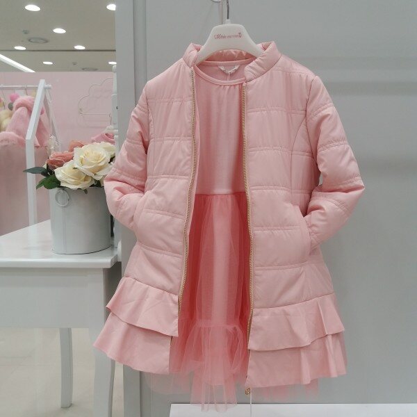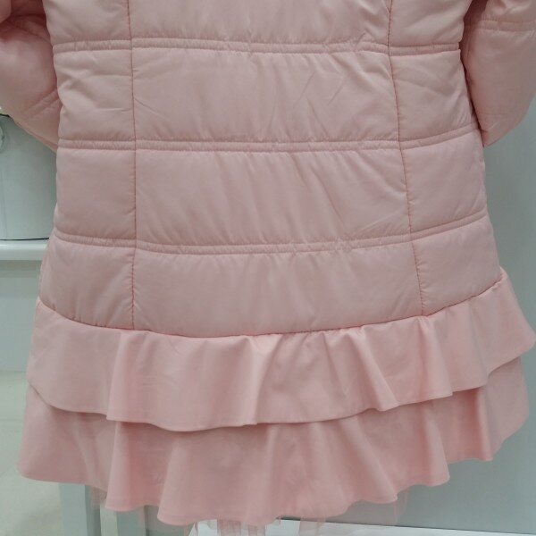 부드러운 소재의 초봄에 입기좋은 패딩입니다.귀여운 핑크 컬러에 밑단에 2단으로 후레아가 달려 귀여움을 더합니다.프린세스 라인이 들어가 예쁜라인이 연출됩니다.