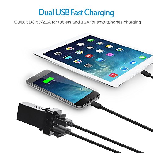 - Fast charging at full speed, input 12V/24V, output 5V 2.1A for tablet, 1.2A for smartphone