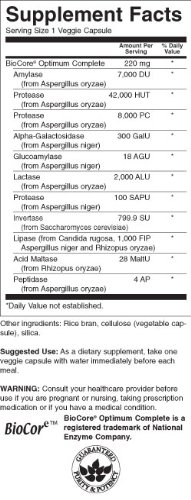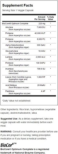 The ultimate enzyme formula is here! Swanson Ultra BioCore Optimum Complete contains enzymes to address every aspect of the enzymatic digestive process, including lactase to help digest lactose from dairy products; alpha-galactosidase assists with the breakdown of certain sugars from grains and vegetables; and acid maltase to help your body digest maltose, a common intermediate sugar in the digestive process. Each enzyme in BioCore Optimum Complex helps support the digestive process and promotes regularity.Feature