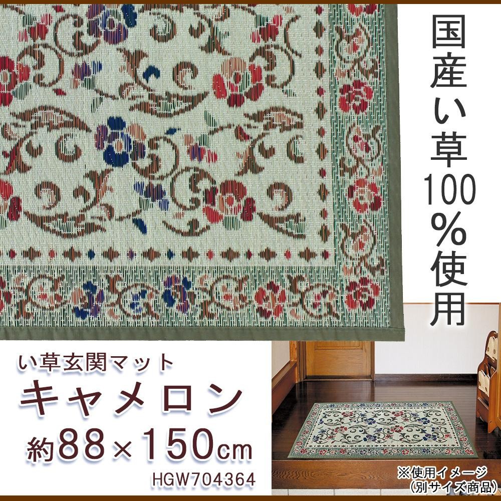 玄関をオシャレに演出するい草玄関マット。原料のい草は、色つやが良く粒揃いの良い柔軟性のあるい草を厳選して使用しています。 製造国:日本 素材・材質:国産い草100% 商品サイズ:約88×150cm 重量:約1.2kg 仕様:裏面:滑りにくい加工 付属品:取扱説明書 ※サプライヤー直送品 ご注文後3~4営業日後の出荷となります【商品名】い草玄関マット キャメロン 約88×150cm HGW704364