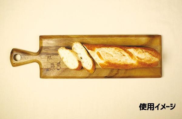天然のアカシアを使用したウッドボードです。表面には楽しそうにパンケーキを運ぶムーミンとリトルミイが、裏面にはムーミンのロゴの焼印が入っています。 |