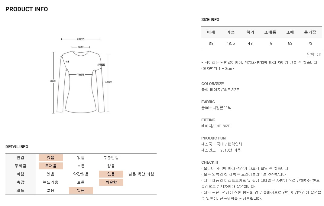 모델(키:164)이 착용했을 때 힙을 덮어주는 기장이였어요