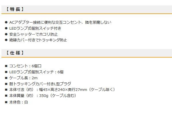 fk094igrjs交互に配置されたコンセントなので隣を邪魔することなくACアダプターが使えます LEDランプ式の個別スイッチ付きですサイズ個装サイズ:11×33×3cm重量個装重量:350g製造国中国ACアダプター接続に便利な交互コンセント仕様の電源タップ!!交互に配置されたコンセントなので隣を邪魔することなくACアダプターが使えます LEDランプ式の個別スイッチ付きです