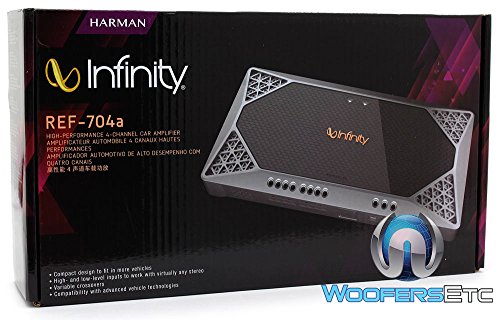 Infinity Reference Series REF-704A 4-Channel Amplifier | RMS Power Rating: 4 ohms: 70 watts x 4 chan. | 2 ohms: 100 watts x 4 chan. | 1 ohm: ------------N/A------------ | Bridged, 4 ohms: 200 watts x 2 chan. | Total power output: 1000 watts