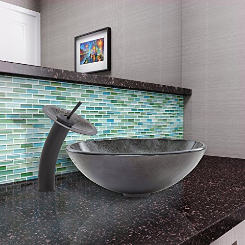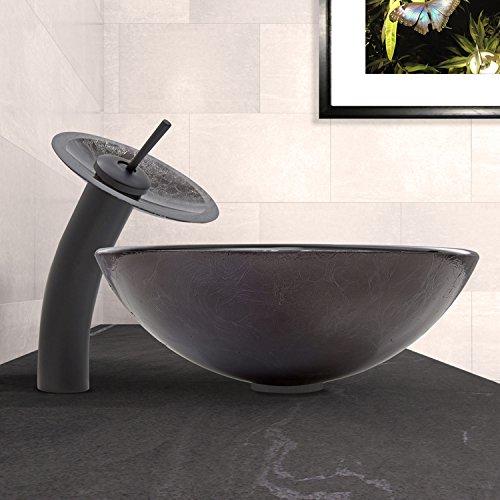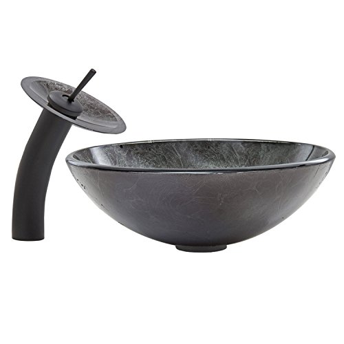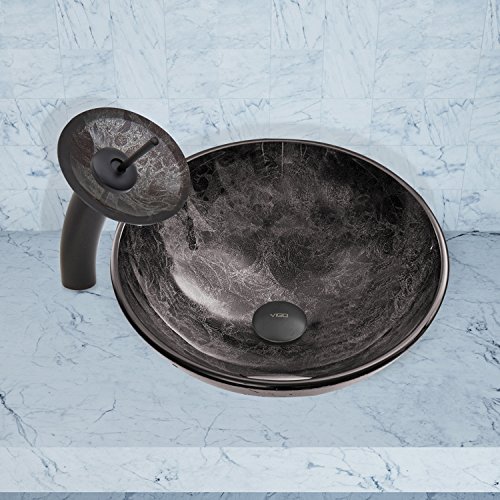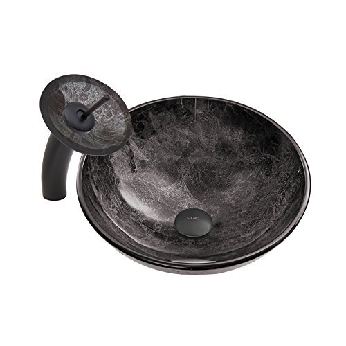 VIGO Gray Onyx Glass Vessel Bathroom Sink and Waterfall Faucet with Pop Up, Matte Black