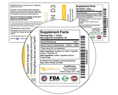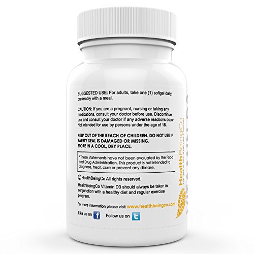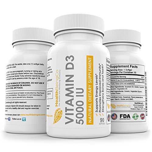 -. Binding : Health and Beauty -. Brand : HealthBeingCo -. EAN : 0646437518901 -. Feature : SUNSHINE VITAMIN: Vitamin D is the sunshine vitamin. Benefit from the benefits of a vital nutrient without the exposure to sunshine and harmful UVB rays. Perfect for those who live in colder and very warmer climes! / PURE QUALITY SUPPLEMENT:Non GMO and NO harmful ingredients and manufactured to GMP standards. With HealthBeingCo's Vitamin D3 you can be reassured we tick all the boxes. / EASY TO SWALLOW: Softgels capsules are easy and convenient to take. / 100% 'No Problem' GUARANTEE: HealthBeingCo Vitamin D3 comes with a no questions asked 90 day guarantee for all! / MADE IN USA: Manufacturing FDA approved and GMP compliant. You can have the peace of mind you are using is of the highest standards. -. IsAdultProduct : 0 -. Label : PLSupplements -. Manufacturer : PLSupplements -. ProductGroup : Health and Beauty -. ProductTypeName : HEALTH_PERSONAL_CARE -. Publisher : PLSupplements -. Studio : PLSupplements -. Title : HealthBeingCo Vitamin D3 5000 IU in Softgel Capsules - Cholecalciferol - High Potency - FDA Grade Natural Sunshine Vitamins Supplement GMP Compliant and Verified - 90 Day 'No Problem' Guarantee! -. UPC : 646437518901