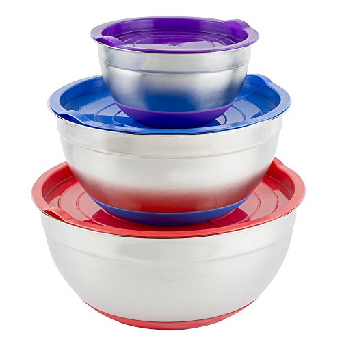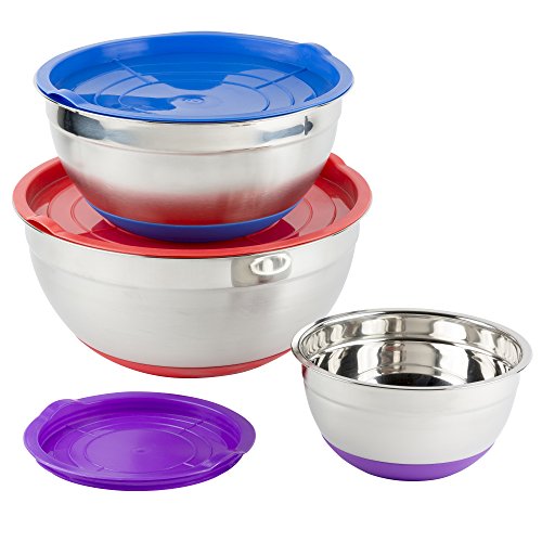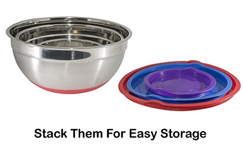 Stainless Steel Mixing Bowls With Lids And Non Slip Silicone Base | Set Of 3 Different Colors Includes Purple Blue And Red | Sizes 1.5 Qt, 5 Qt, 8 Qt.