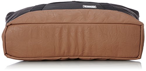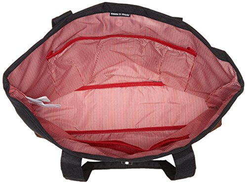Tote bag featuring flat top handles, buckle strap closure, and logo patch on front pocket
