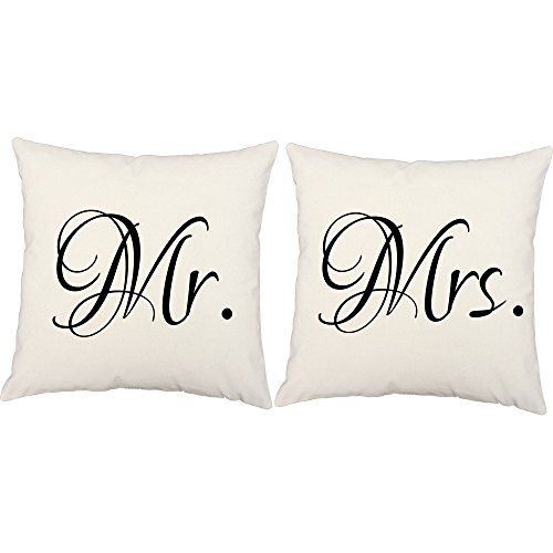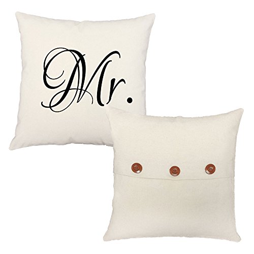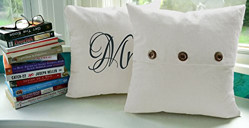 Set of Two Mr. and Mrs. Throw Pillows 16x16 Inch Square White Cotton Cushions