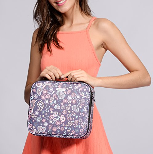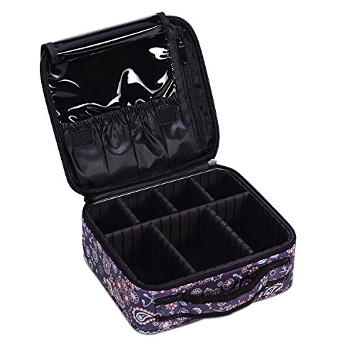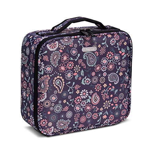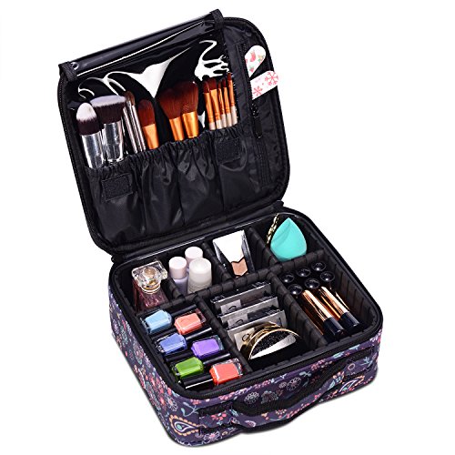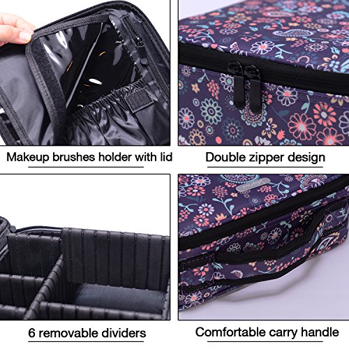 JOLIGRACE Portable Makeup Train Case Travel Size Cosmetic Bag Organizer with Brush Holder Pockets and Removable Dividers for Makeup Artist (Purple Floral)