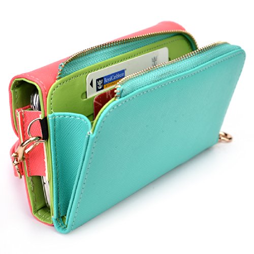 -. Feature : Money holder with 2 credit card slots / Universal smartphone compartment measures 6.60 x 3.70 x 0.50 inches / Precise real stitching / Detachable wrist and shoulder strap / Green pu leather interior