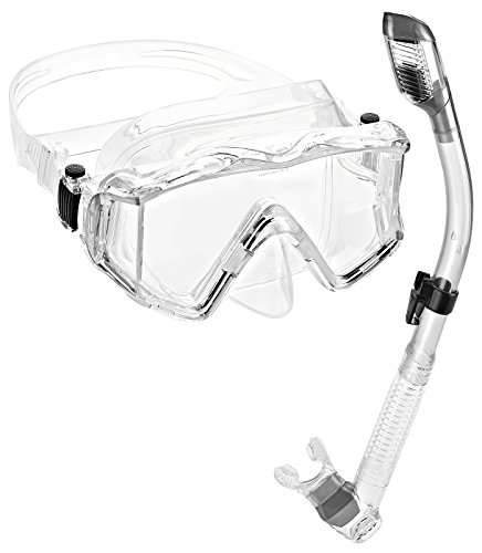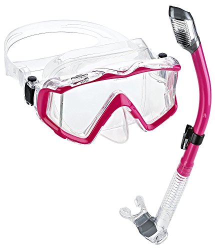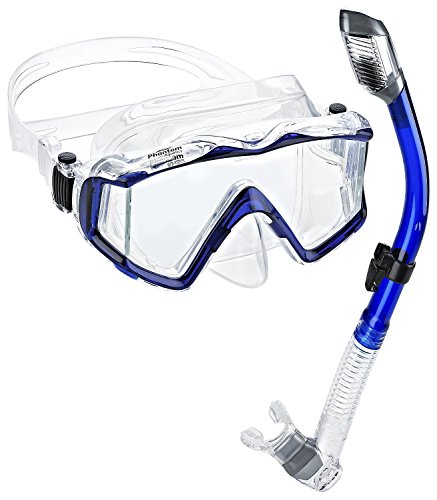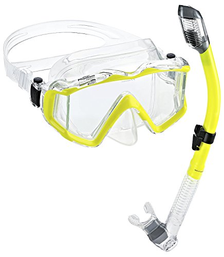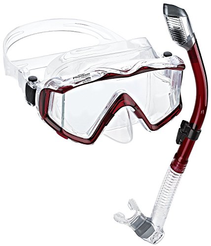 PANORAMIC MASK: The new Panoramic View Metallic range from Phantom Aquatics. The Panoramic mask offers a Crystal clear view exploring the underwater world, double sealed silicone skirts are used for superior fit and comfort and patented single lens with seamless side window ensures a panoramic field of vision. DRY SNORKEL: Inventively designed to keep water out when submerged and on the surface, the Phantom Aquatics Dry Snorkel will help you breathe easy. A unique splash guard at the top reduces water entrance when snorkeling, while the completely dry top and bottom purge valve make for easy, underwater swimming. The silicone mouthpiece offers a comfortable fit, allowing you to explore hours on end.