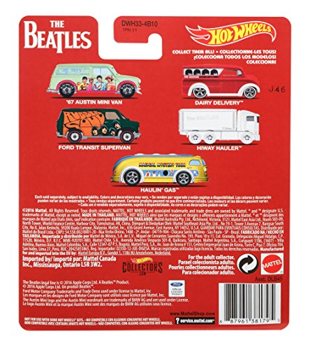 -. Binding : Toy -. Brand : Hot Wheels -. EAN : 0887961381795 -. Feature : The Hot Wheels Pop Culture Assortment gives you a combination of fan favorite castings with the most iconic Pop Culture brands! / These awesome themed assortments celebrate Star Trek, global brand Marvel, phenomenal DC Comics, the epic space odyssey Star Wars and others like Peanuts and Nestle! / These six popular Hot Wheels 1:64 scale vehicles feature Real Rider tires and authentic decos / Great gift ideas for your pop culture enthusiast with packaging that corresponds to the deco for each model / Collect them all! -. IsAdultProduct : 0 -. Label : Mattel -. LegalDisclaimer : 17-131 -. Manufacturer : Mattel -. Model : DWH33 -. MPN : DWH33 -. NumberOfItems : 1 -. PackageQuantity : 1 -. PartNumber : DWH33 -. ProductGroup : Toy -. ProductTypeName : TOYS_AND_GAMES -. Publisher : Mattel -. Studio : Mattel -. Title : Hot Wheels The Beatles Dairy Delivery Vehicle -. UPC : 887961381795 -. Warranty : 1 year warranty against manufacturer defects