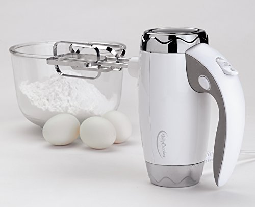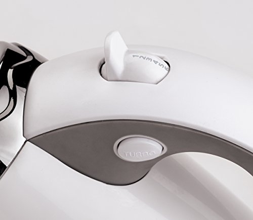 This hand mixer is a perfect kitchen companion for all of your mixing needs. Ergonomic styling makes it easier to keep mixing instead of your hands getting tired. A heel rest makes it even more stable. The chrome plated professional wire beaters are great for beating cream, eggs and other traditional things. The dough hooks are great for mixing bread. 7 speeds with a Power-up burst on all settings give you plenty of power for even hard mixing jobs.Feature