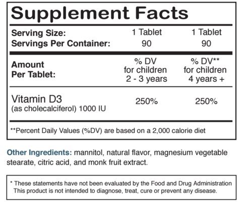 Tasty Sugar-Free Vitamins for Kids! D3 increases calcium absorption for strong bones and teeth for children