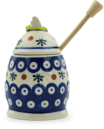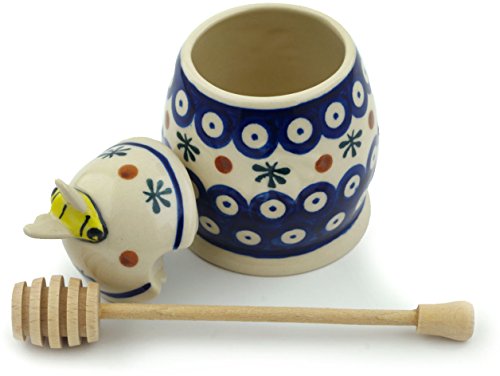 Studio : Boleslawiec Publisher : Boleslawiec Product Description Polish Pottery Honey Jar with Dipper 5-inch Mosquito Dimensions: 3½" wide, 3½" long, 5¼" high Capacity: 9oz Polmedia Polish Pottery Stoneware is: * Hand crafted and hand painted in Boleslawiec, Poland * Microwave safe, dishwasher safe, oven safe up to 480 F, freezer safe * Lead and cadmium free * Crack and chip resistant * Intended for everyday use, easy to clean * Highly collectable About Polish Pottery Polish pottery is known for its versatility in the kitchen and on the table. It is safe for use with food in the microwave, freezer, oven and dishwasher. Polish stoneware is resilient to abrasives making it durable and resistant to scratching or chipping. It distributes heat evenly for perfect baking and is also nonstick for easy clean-up, making it easy to care for. The bright patterns never fade, and are offered in thousands of variations to mix and match. It is this combination of function and beauty that makes Polish pottery so appealing. The pottery is fired in electric and gas kilns at temperatures exceeding 2200 degrees Fahrenheit. This results in a stoneware that is meant to resist aging and provide lasting beauty that stands the test of time. Polish stoneware is lead and cadmium free. Polish Pottery is hand crafted and hand painted in the Boleslawiec region of Poland. This region is famous for its naturally found white clay which artisans have used for centuries to craft this durable and beautiful stoneware. Each piece of pottery is carefully formed and painted by hand to ensure that exceptional attention to detail is paid to each piece. The most beautiful and intricate patterns are called UNIKAT patterns. These patterns bear the artist's signature. 0