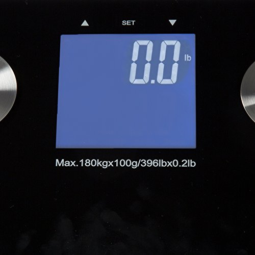 -. Feature : Large Easy to Read LCD Display with Blue Backlight, Low Battery Indicator, Overload Indicator, 10 User Memory Capacity / Displays Body Weight, Body Fat Percentage, Body Water Percentage, Body Muscle Percentage, Bone Mass Substance, BMI and Calorie Count / Light Weight, 5 mm Tempered Safety Glass Platform, Automatically Turns On and Off When You Step On the or Off the Scale / Measurement Can be Set to Kilograms or Pounds, Max Capacity: 396 pounds, Power: 4 AAA Batteries (Included) / Scale Dimensions: 11.5 inches (L) x 11 inches (W) x 0.8 inches (H), LCD Display Dimensions: 3"L x 3"H