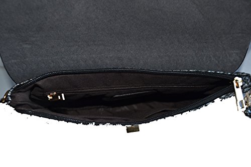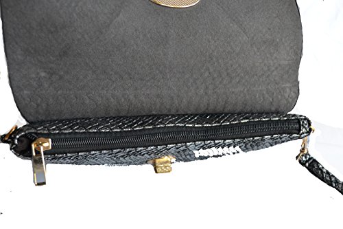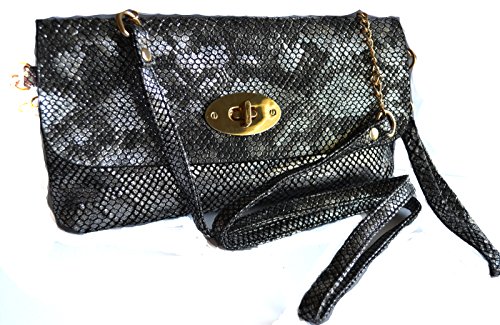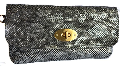 Carry just the essentials in this metallic embossed snakeskin print clutch for a casual night out in town. Gold tone turn lock closure flap. Top zipper closure. Interior 1 wall zip pocket and 1 slip pocket. detachable wrist strap and cross body strap with gold tone chain accents.Feature