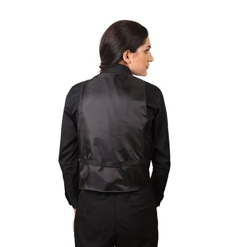 Product Description Women's black silver glitter pinstripe pattern vest with adjustable full back and 4 buttons. Matching ties sold separately. Sizes 2XL and up sold at additional cost. 0