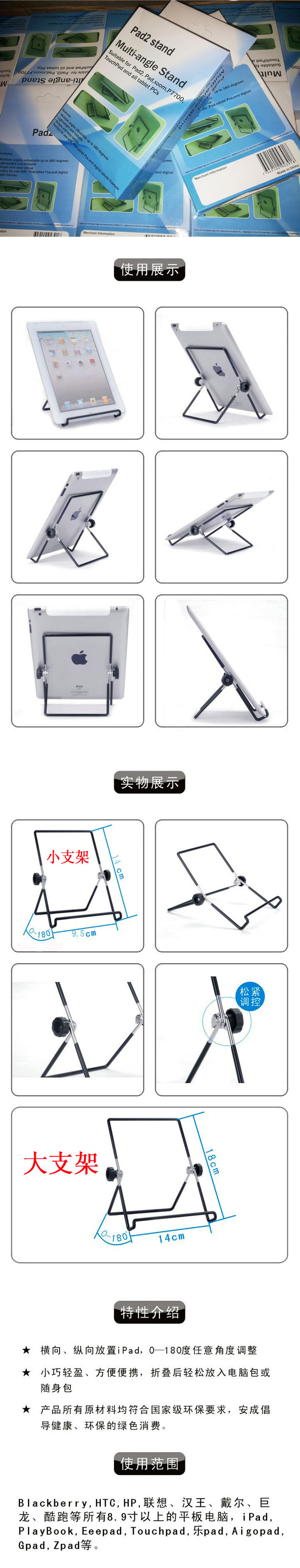 First, the horizontal and vertical placement IPAD ,0-180 degrees at any angle adjustment;
