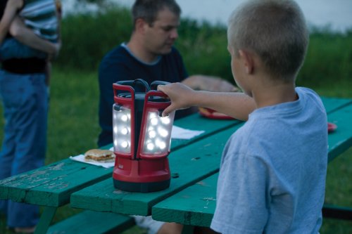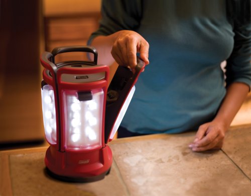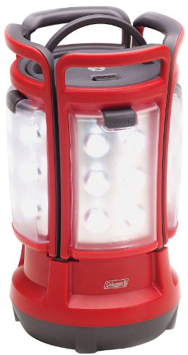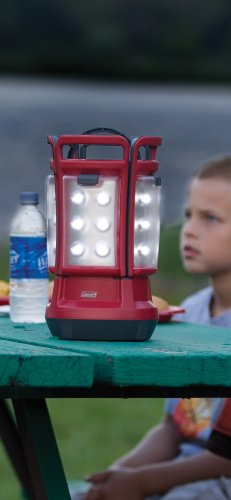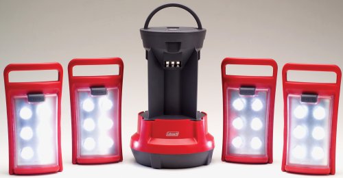 Product Description An area light and four portable lanterns in one clever unit, the Coleman LED Quad Lantern is a versatile choice for indoors or outdoors. The Quad Lantern's four removable panels hold 24 LEDs total. Each of the four sections can be removed and carried as a portable light to go to the shower house, tent, or wherever one of your group needs some light. When the sections are returned to the lantern base, they easily reattach and immediately start to recharge as well as illuminate. The Quad Lantern features six 5mm white LEDs in each panel (24 total), shedding 190 lumens of light. The wide-angle LEDs are behind a textured lens for dispersed lighting. Each section also has a handle on top to carry it or hang it. A main on/off switch is located on top of the lantern; each removable section also has its own switch. Powered by eight D-cell batteries (not included) that are housed in the lantern base, the LED Quad Lantern operates for up to 30 hours. Each of the four panels also contains an included rechargeable NiMH battery that powers the panel while in use away from the base. When docked back into the base station, each panel is recharged from the main D-cell. Each fully-charged panel will run for up to 1.5 hours while separated from the base.
