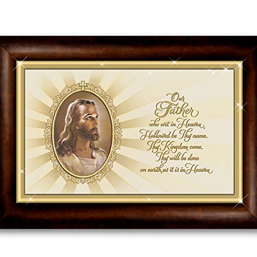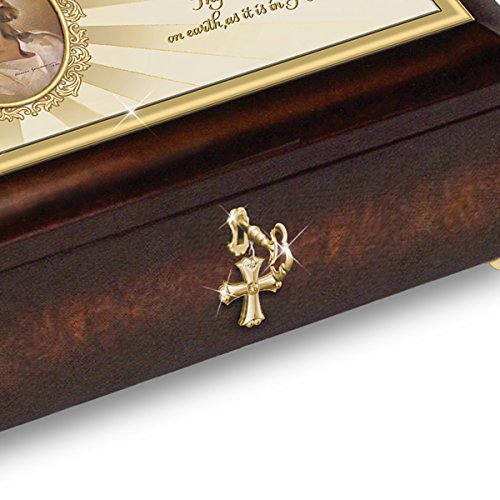 Feature : Keep your faith close at hand and always in your heart with The Lord's Prayer Music Box, inspired by the beloved prayer found in Matthew 6:11, available only from The Bradford Exchange / Exquisitely handcrafted, the Lord's Prayer music box features the definitive "Head Of Christ" image created by famed religious artist Warner Sallman (in 1994, the New York Times considered him to be the best known artist of the century) on the lid, along with words from "The Lord's Prayer" in delicate script / Elegant filigree frames the top of the lid and encircles the portrait of Christ while the mahogany-finished heirloom box lined in black velvet rests gracefully on four golden ball feet / A golden key and gold-plated cross charm on the front add more delight / Plays the beloved melody of "Amazing Grace"