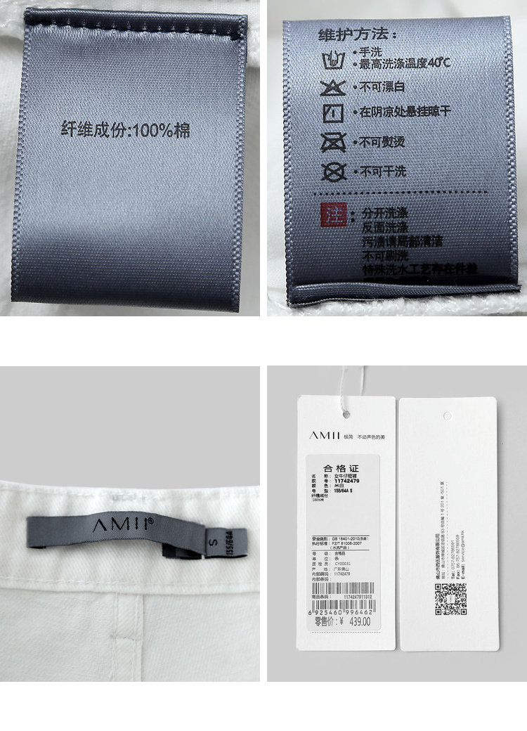 | 洗涤标准: | 不可浸泡不可漂白不可熨烫悬挂晾干40℃以下手洗不可干洗 |