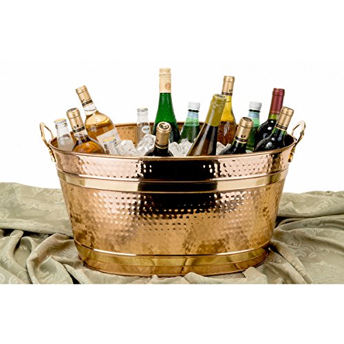 -. Feature : Create a lively, welcoming aura with this copper party bucket / Heavy-gauge steel construction offers functional appeal and copper plating offers aesthetic look / Cool a variety of drinks in this bucket to conveniently serve guests / Bucket can also be used to store magazines and decorative items when not in use / Bucket has a holding capacity of 11 gallons, providing ample room for drinks