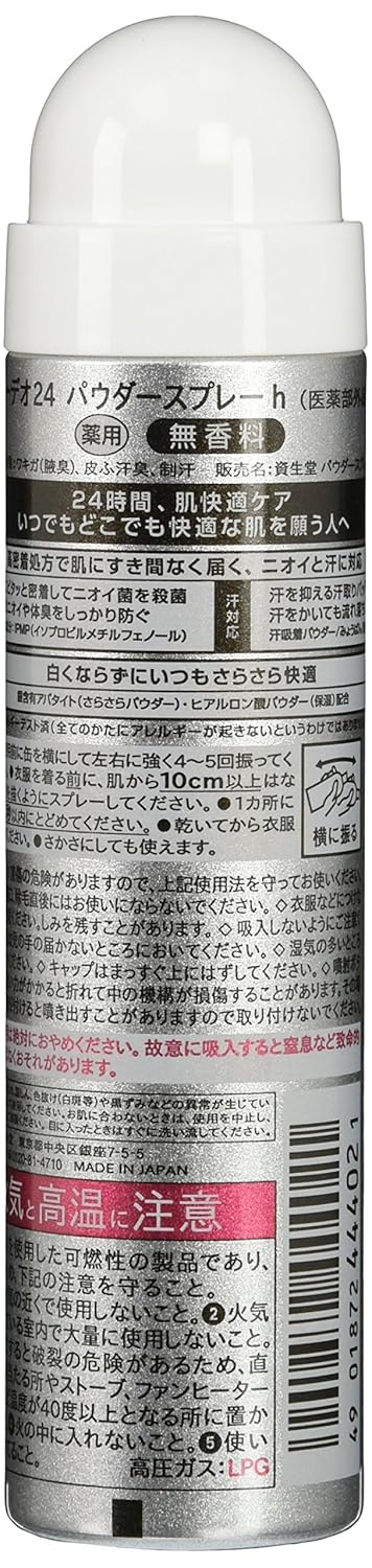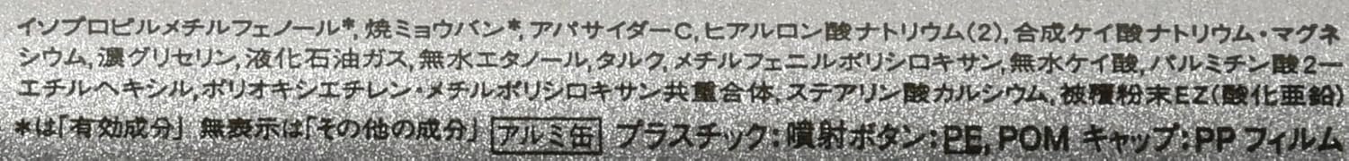 全成分:イソプロピルメチルフェノール*,焼ミョウバン*,アパサイダーC,ヒアルロン酸ナトリウム(2),合成ケイ酸ナトリウム・マグネシウム,濃グリセリン,液化石油ガス,無水エタノール,タルク,メチルフェニルポリシロキサン,無水ケイ酸,パルミチン酸4-エチルヘキシル,ポリオキシエチレン・メチルポリシロキサン共重合体,ステアリン酸カルシウム,被覆粉末EZ(酸化亜鉛)*は「有効成分」無表示は「その他の成分」