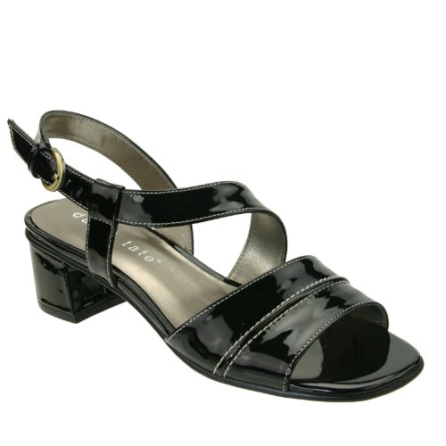 You'll signal sleek sophistication in the David Tate Nessie sandal. This dressy women's slingback sandal features a patent leather upper and matching toe box, along with a sexy symmetrical strap that covers the instep and becomes an adjustable slingback strap at the ankle. Light padding in the footbed cushions and supports the shaped heel that adds a lift. With a synthetic sole for smooth transitions, the David Tate Nessie slip-on finished any outfit with sure footing and lasting wear.Feature