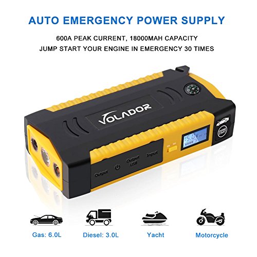 VOLADOR 600A Peak Car Jump Starter, 18000mAh 12V Portable Vehicle Battery Booster(Up to 6.0L Gas or 3.0L Diesel Engine), Multifunction Power Bank Auto Emergency Kits with Smart Clamps