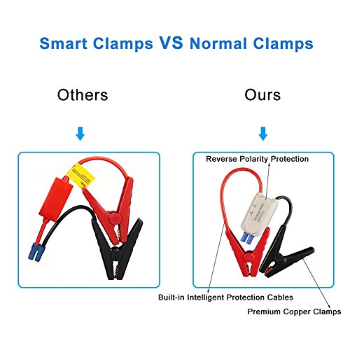 POWERFUL & COMPACT: Jump start your vehicle (up to 6.0L gas or 3.0L diesel car, motorcycle, yacht, etc) up to 30 times with 600A peak current and intelligent clamps and cables. Compact enough to store in your glovebox.