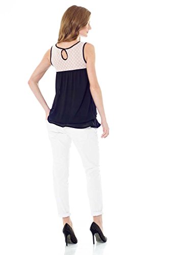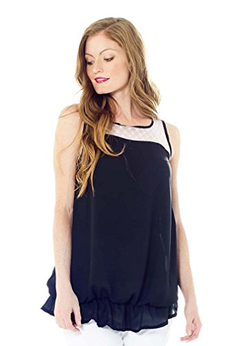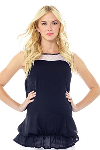 A flowing chiffon tank blouse with a white mesh neck detail, key hole back, and banded ruffle bottom hem.