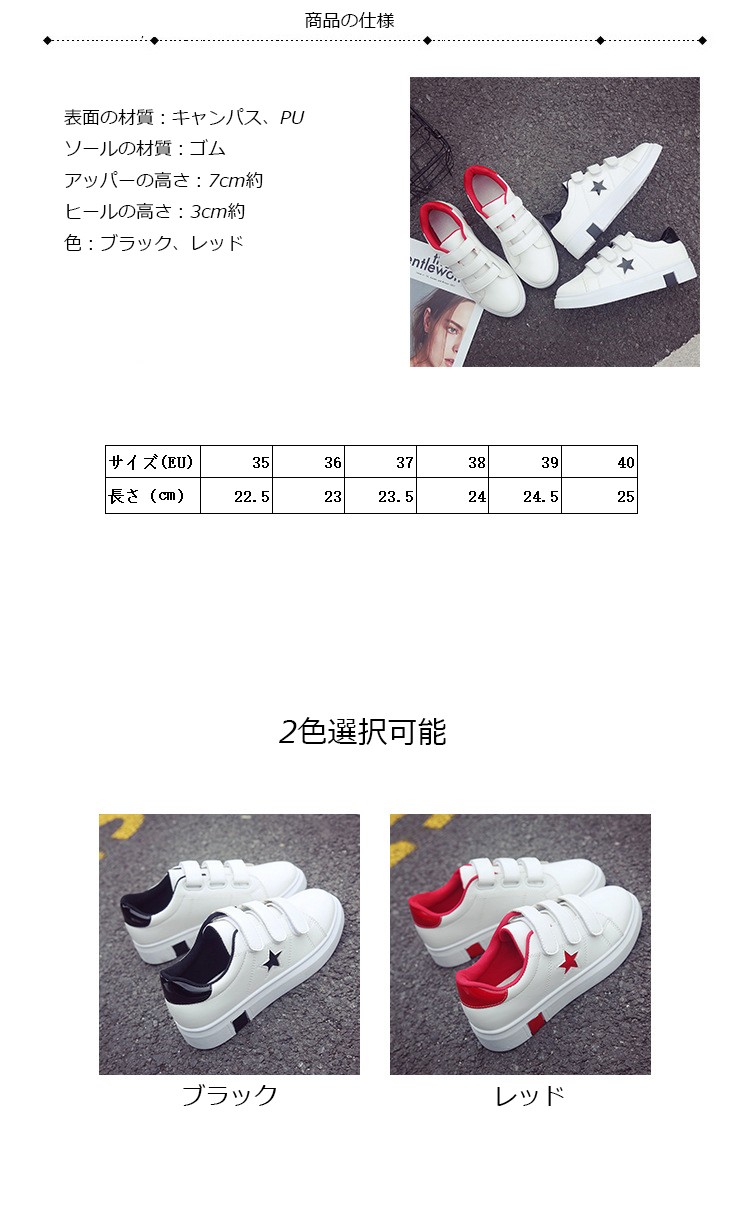 商品番号:XZ011材質:PU+ゴム色:ブラック、レッドヒールの高さ:3cm約 アッパーの高さ:7cm約サイズについてEU35=22.5cm EU36=23cm EU37=23.5cm EU38=24cm EU39=24.5cm 注意:※ サイズなど、商品詳細を必ずご確認後、ご了承頂いた上でご購入をお願いします。また、採寸方法違いにより、0.5~1cmの誤差がございますので、ご了承ください。商品内容:1xスニーカー特徴:【軽量、通気性よい】ゴムのソールとPUの材質でスポーツシューズならではの軽さを実現し、通気性もよいです。どんな季節でも着用します。 軽量なので、ランニングや歩くや他の運動が易くになりました。【ファッションな配色】ファッションな配色で、シューズがファッションになり、女性に最適です。中学生などに通学靴としてもよい選択です。 【ゴムのソール耐滑】柔らかい材質で作って、ゴムのソールので、耐滑のです。スムーズな足運びをサポートします。球技や他の運動にもスムーズになりました。【利用場合】スポーツだけでなく、通勤や通学やアウトドア、普段履きとしても カジュアルなコーディネートをお楽しみい ただけます。