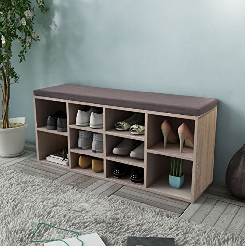 -. Title : SKB family Shoe Storage Bench 10 Compartments Oak Color Home Entryway Hallway Upholstered Seat Furniture