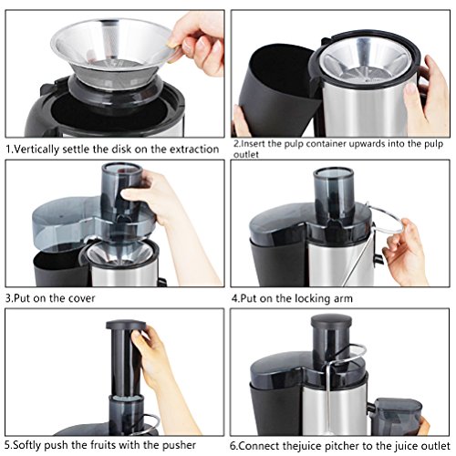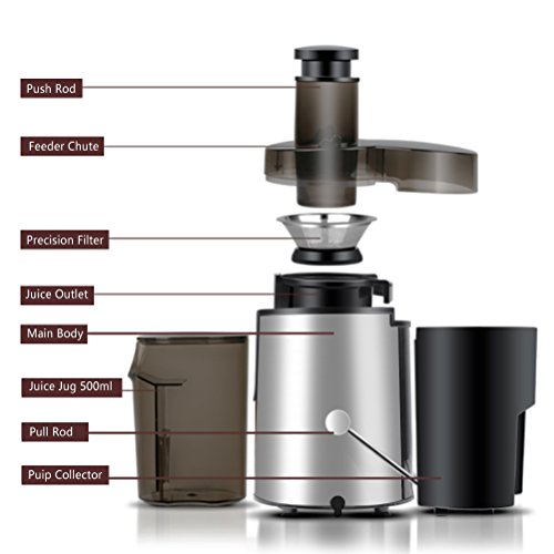 EASY TO USE AND CLEAN UP: Just turn on the juicer and put fruits into the feedport, it will operate automatically and making fresh juice. All removable parts are dishwasher safe and easy to assembly. Juicer filter and blade also can be easily cleaned by attached washing brush. But the motor base it not dishwasher safe, do not spray with water or any liquid for the motor