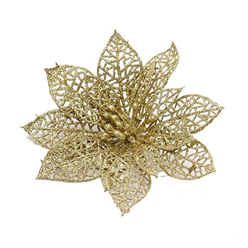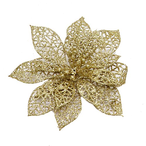 HUELE 10 pcs Christmas Flower Glitter Gold Poinsettia Christmas Tree Ornaments (Gold)
