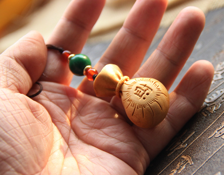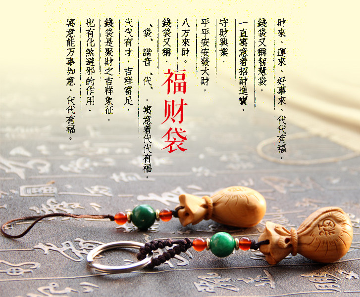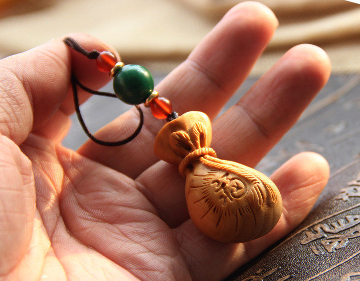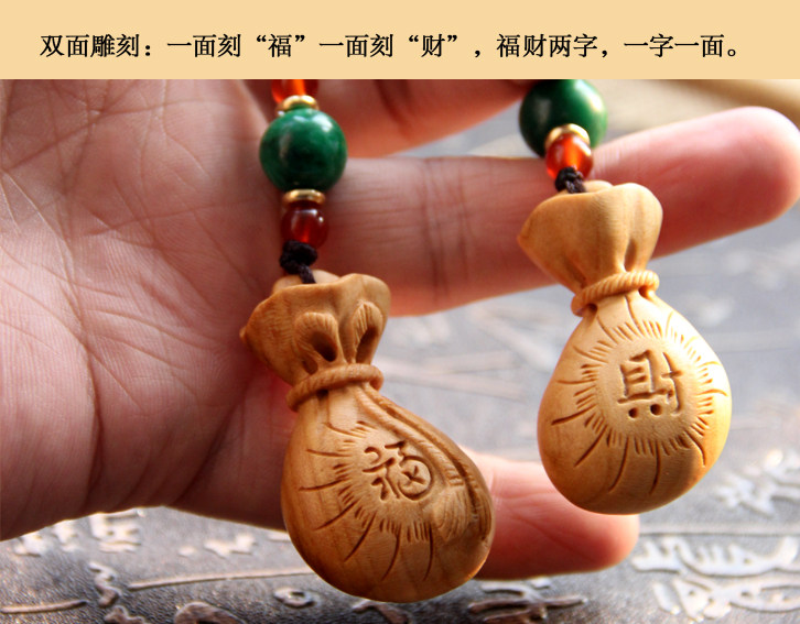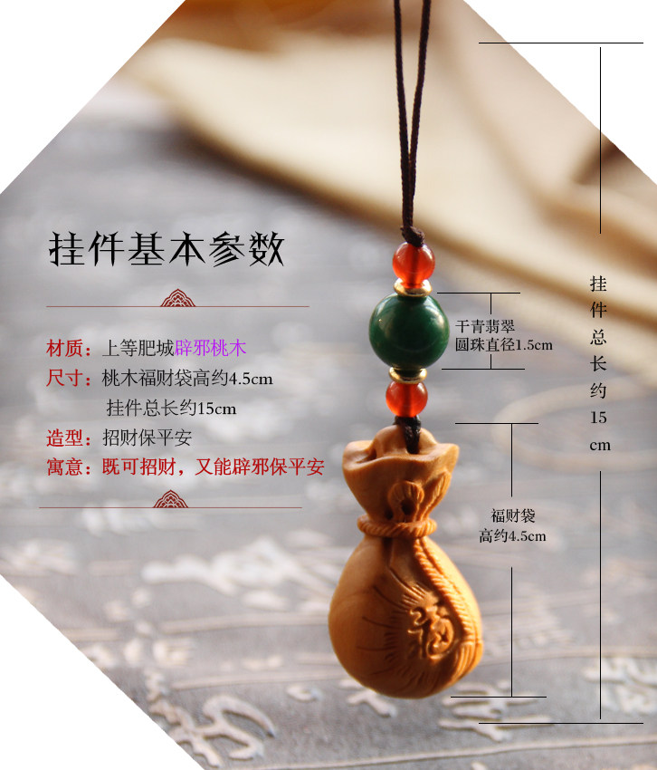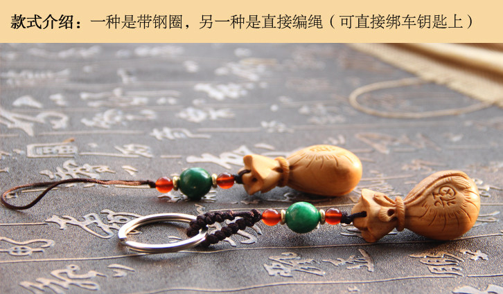 钥匙扣 汽车钥匙挂件 挂饰 桃木雕刻福袋 辟邪保平安 带BV绳流苏