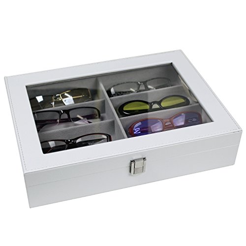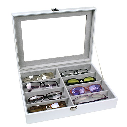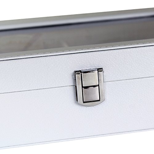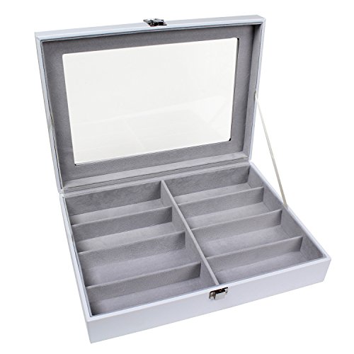 -. Feature : ELEGANT & STYLISH - Beautiful white faux leatherette case with gray fabric interior allows all the watch enthusiasts to store, display and show your watches while keeping them away from dust, fingerP.R.Ints and scratches / GLASS LID & LOCK - Features a clear glass top lid to enable a clear vision of your stored accessories while keeping them free from dust; Along with a metal safety snap lock in the front for adding security / VERSATILITY- Extremely versatile case can also be used to store watches, ties, coins, craft supplies, jewelry collection, a variety of collectibles and keep your accessories in place; Great for personal use at home, a countertop jewelry display in stores or trade shows / FEATURES-Elegant Leatherette cover wooden box with glass top lid; 8 fabric lined compartments that allow you to keep your eyewear separate / MATERIAL & SIZE & NOTICE- Made of glass, metal, velvet, wood and faux leatherette; Approximately measures 13" X 9 1/2" X 2 1/4"H; Accessories NOT included