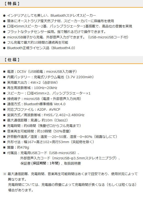 筐体にオーストラリア産天然ブナ材、スピーカーカバーに麻織布を使用しています。ナチュラルで温かみのあるデザインでインテリアとしても美しいBluetoothステレオスピーカーです。