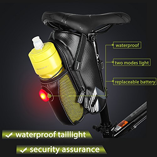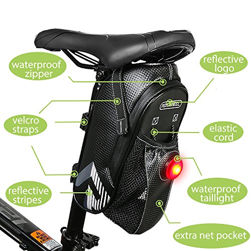 Studio : WOTOW Publisher : WOTOW Product Description Warm tips: 1. The height of the bag is 9.5 inch, please measure your saddle to see if the bag fit for. 2.Please note the net pocket could hold the bottle with maximum diameter of 2.6 inch. 3.The zipper of the waterproof saddle bike may be not so sooth because there is a waterproof coating material on the zipper. 4. Bag Only 5. Please remove the battery protection film before using the tailight.